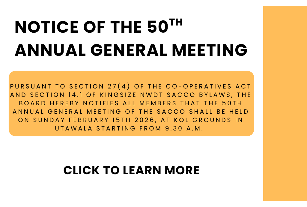 Kingsize Regulated NWDT Sacco is a regulated non-withdrawable deposit-taking Sacco, empowering members since 1977 with affordable savings and loan solutions.